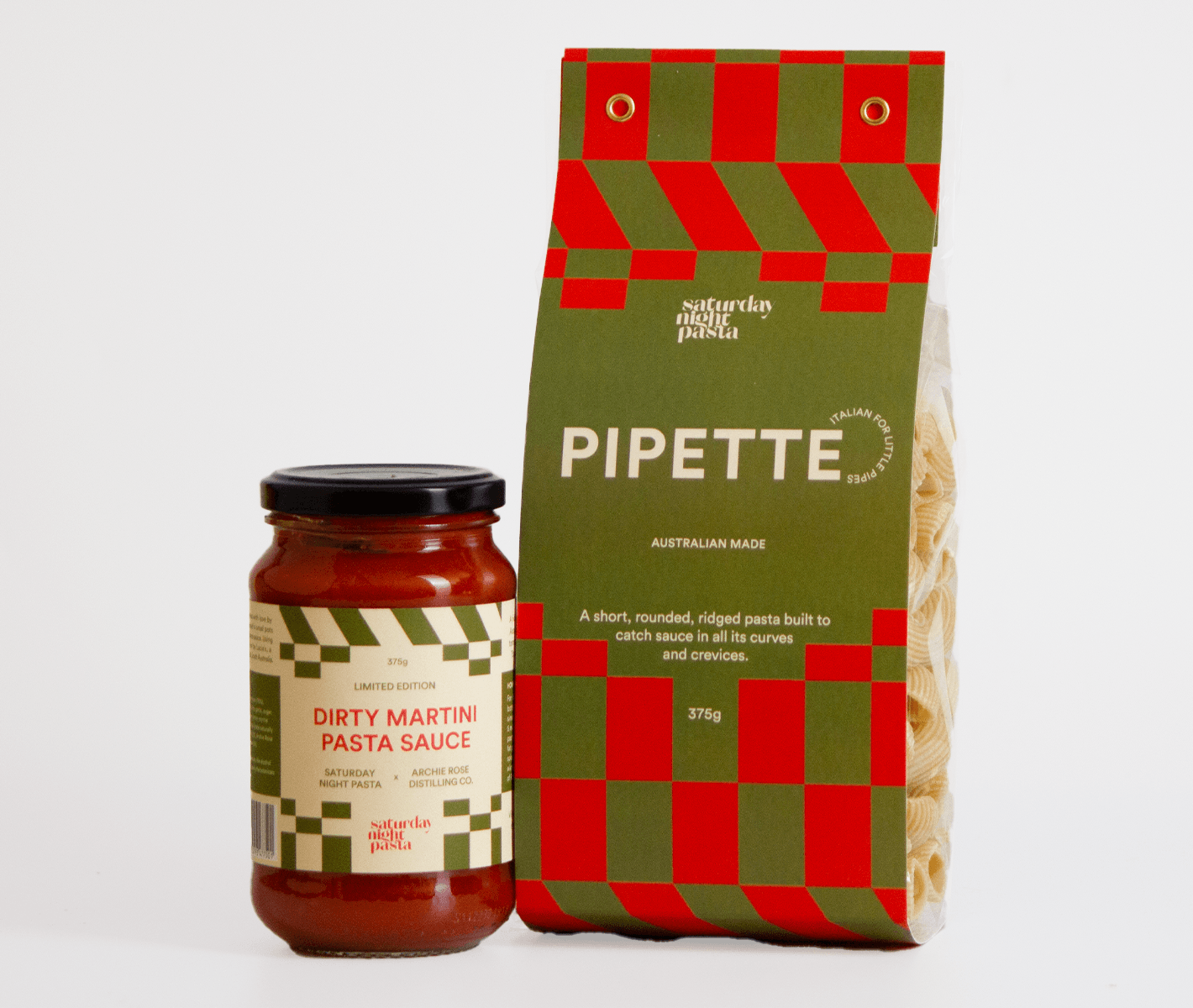 Elizabeth Hewson's Saturday Night Pasta amazingness. Combined! This is the dirty martini sauce and the Pipette pasta. Just needs a bottle of red! It serves 4 people and has a 2 year shelf life...